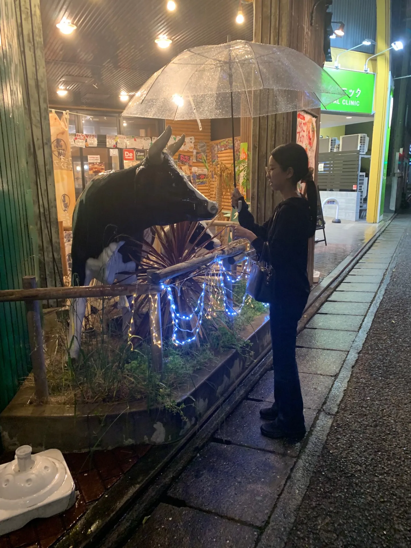 傘をさして、喫茶店前にいるユイさんが見えています。