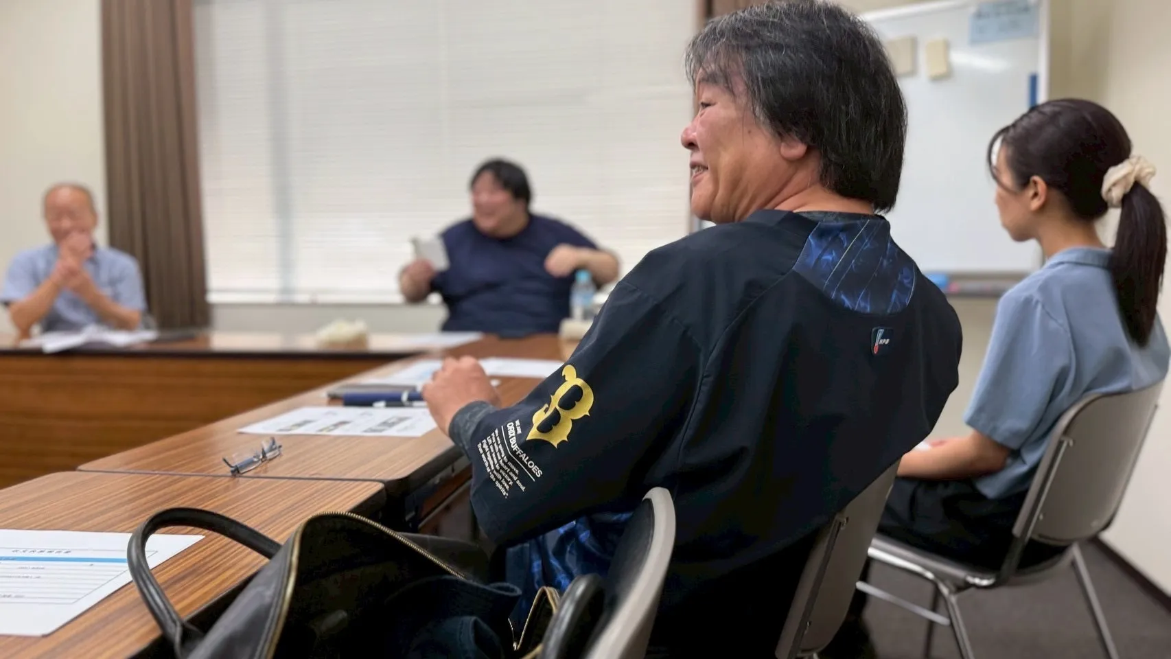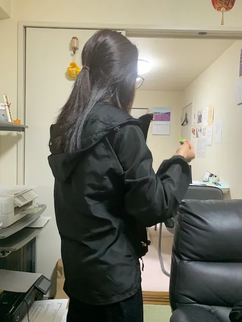 ユイさんは、エアコンで寒くなって上着を着ている場面ですね。