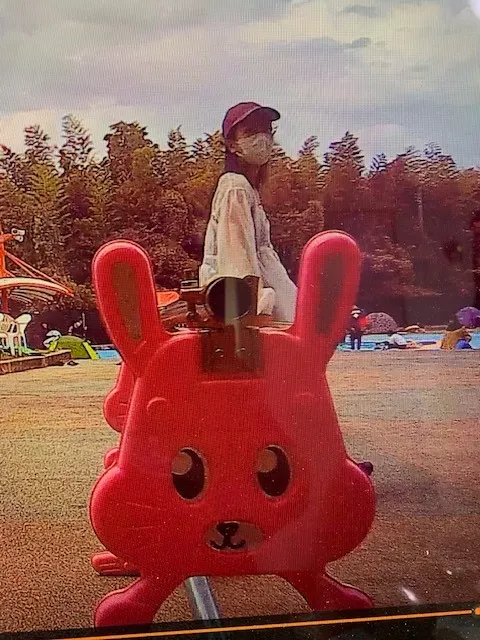 真上写真は、歩行中のケイさんと座って待っている💛ゆかり💛さんですね。