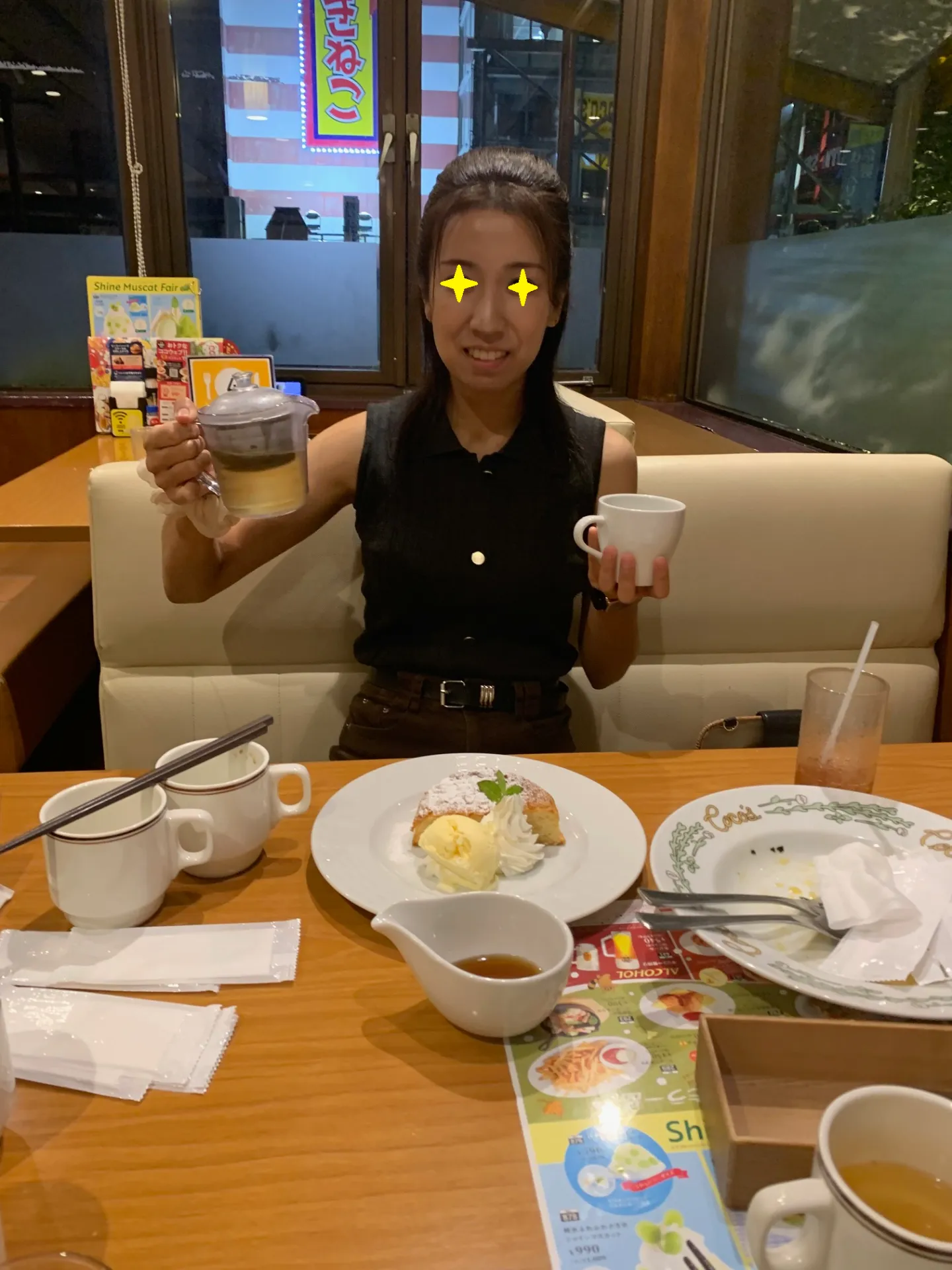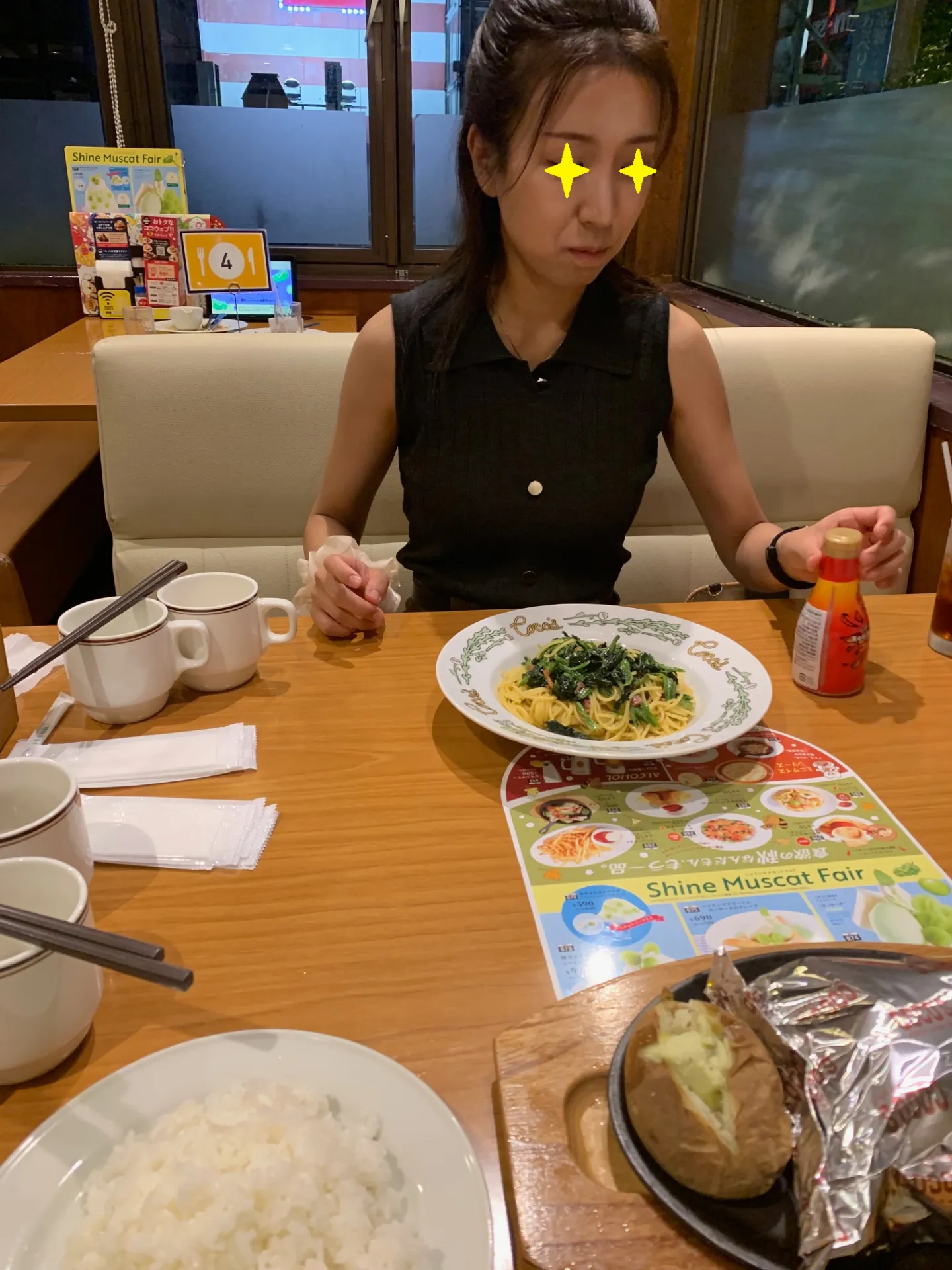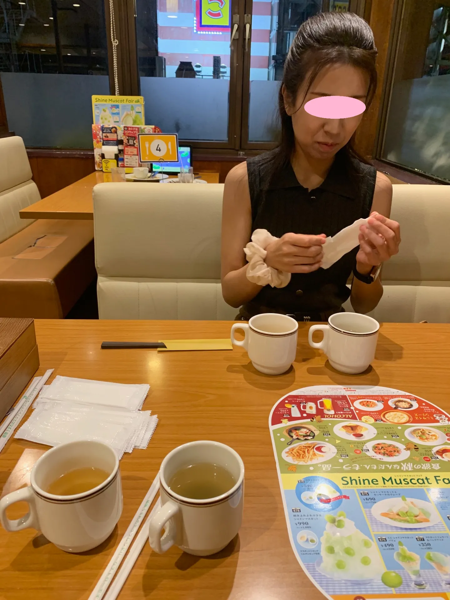 南区大橋地区のファミレスにて夕食をとっております。