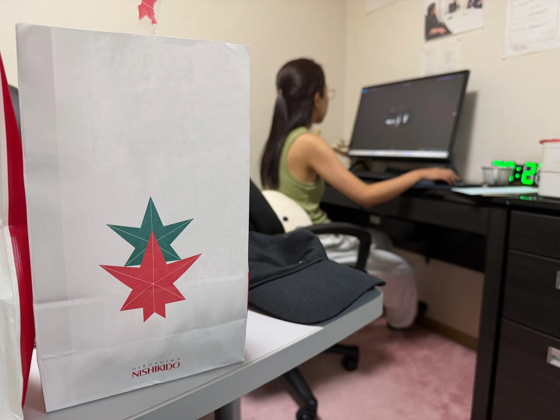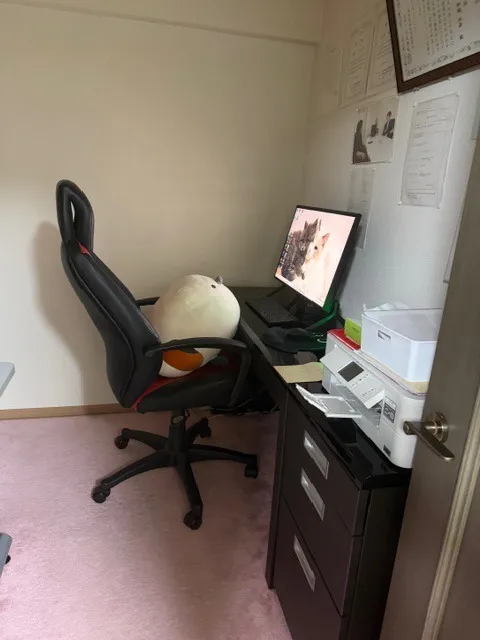 写真は、JR篠栗駅前事務所の自分専用PCで事務作業をしているユイさんですね。