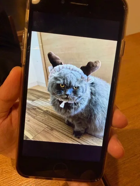 これは「飼い猫ちゃんを鹿にしてしまおう」と思って「角(つの)つきの帽子」を首回りにつけてみたら