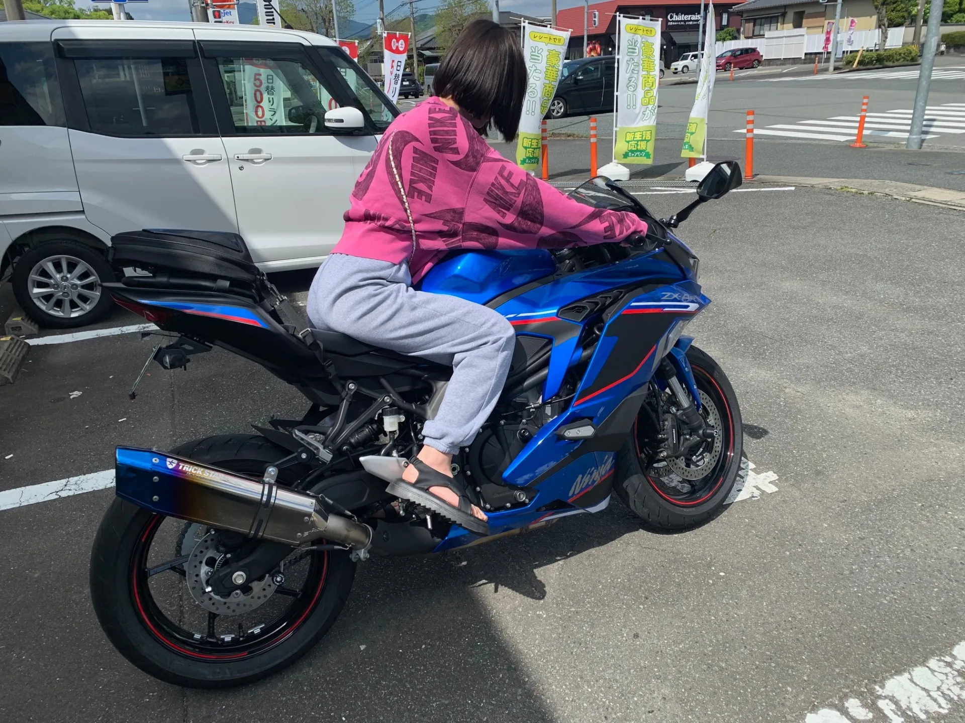 下写真は、自分の私用バイクに試乗しておりますケイさんです。