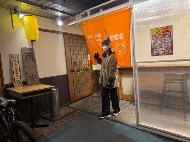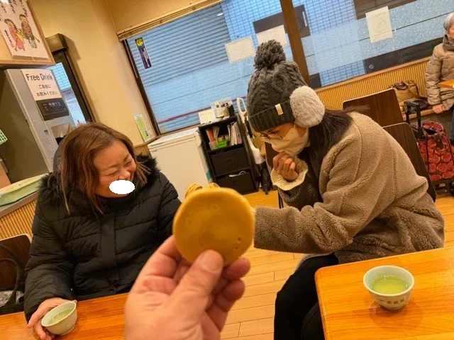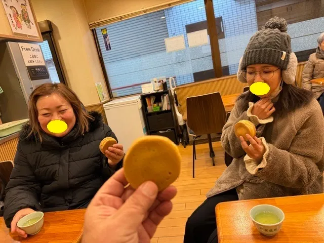2人が西新駅付近の有名な回転焼きのお店で、「回転焼きで乾杯!」をしている場面ですね。