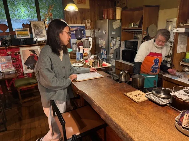 そして、下写真では、カウンターに移動してマスターさんのお話に聞き入る彼女が