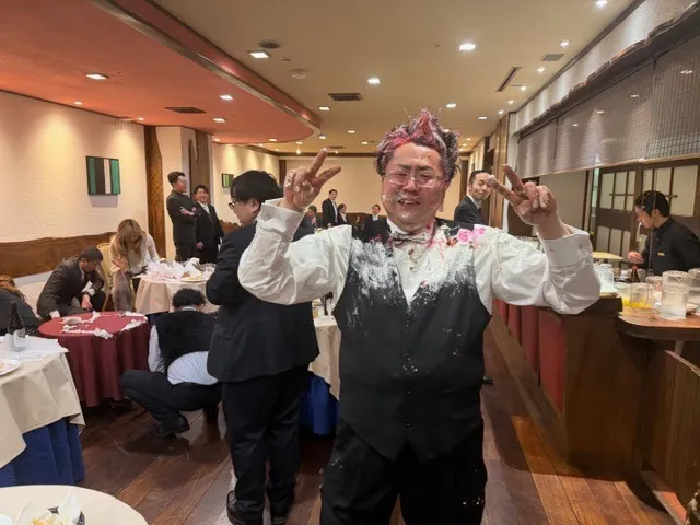 二次会では先輩陣のほうで、彼をクリームだらけにしてしまっており