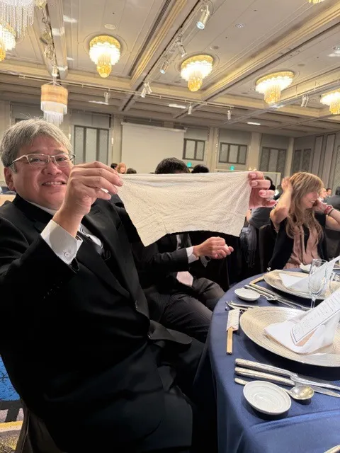 友人がそれを取り出して広げてみますと、なんと「おしぼり」が出来上がったわけです。