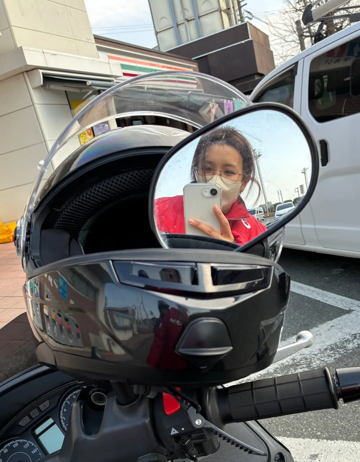 写真は、200ccバイクで高速道路のPAで休憩するユイさんになります。