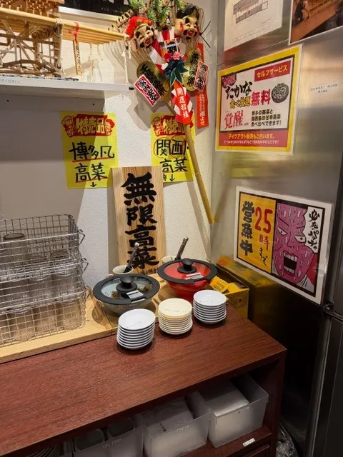 辛子高菜は博多風、関西風と置いており、フリーでいただけます。