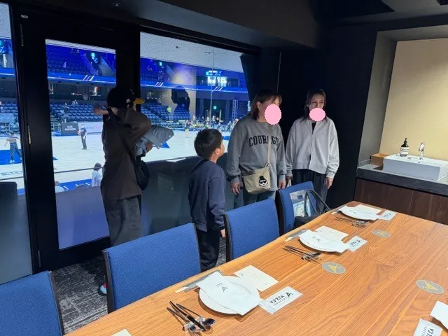 ガラス張りの部屋からは試合会場も見えていますね。